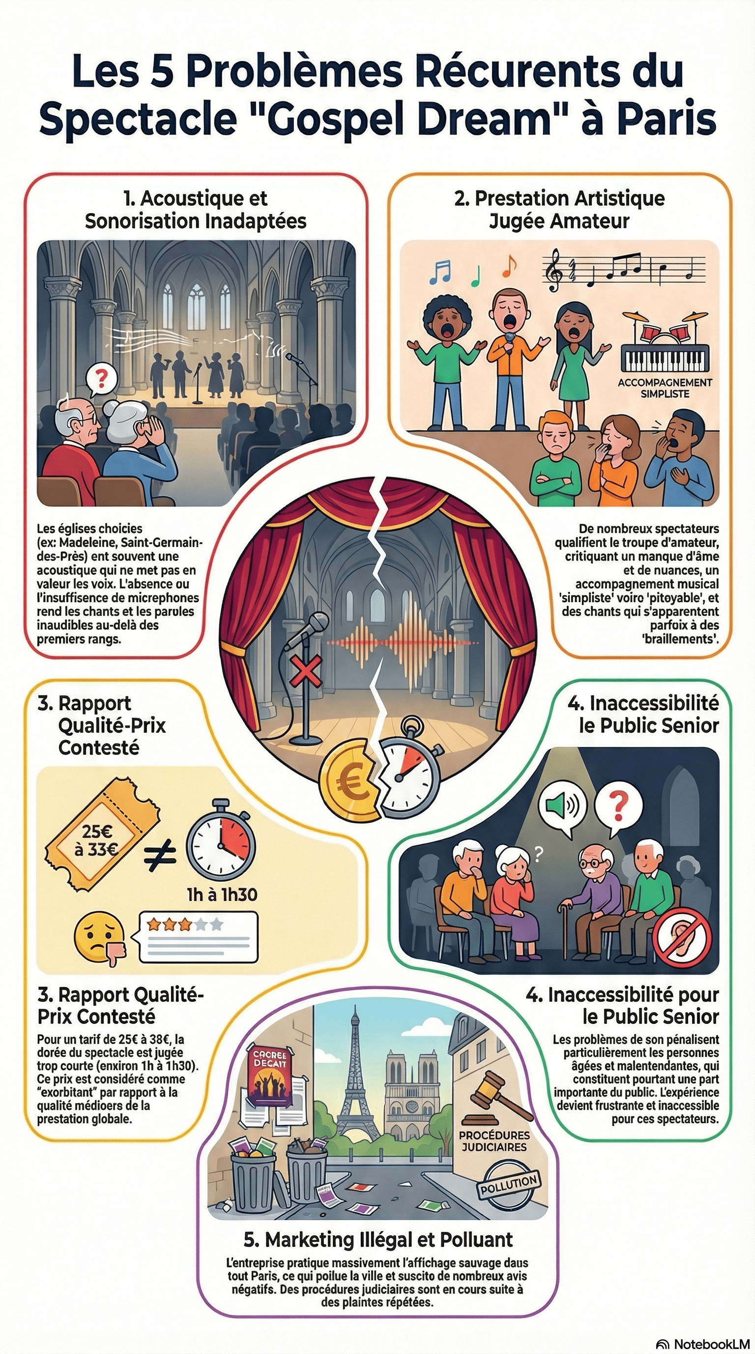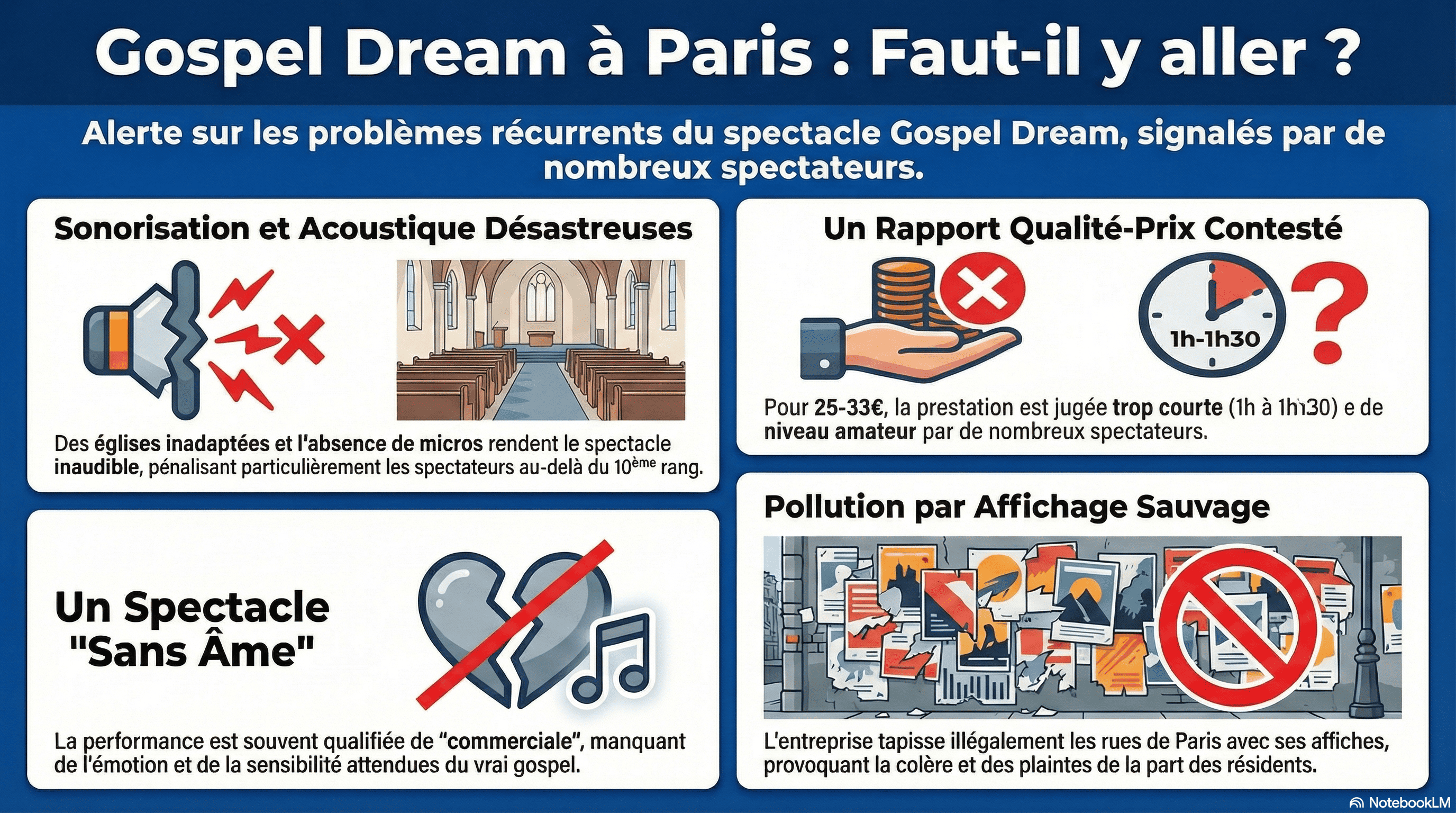Les retours négatifs les plus fréquents concernent l'acoustique défaillante selon les lieux de représentation. Plusieurs spectateurs déplorent que les églises choisies ne mettent pas en valeur les voix.
